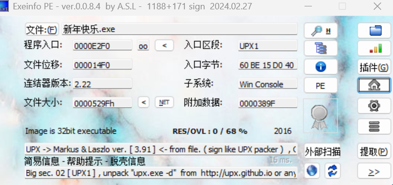 32位,有upx壳,需脱壳(自行下载upx脱壳工具)