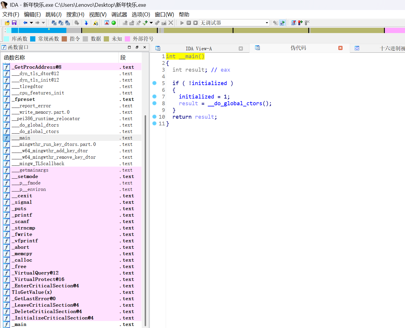 这时再扔进IDA(32位),找到main,F5反编译(注:这里有俩main,对比一下就很清楚地知道该分析哪个)