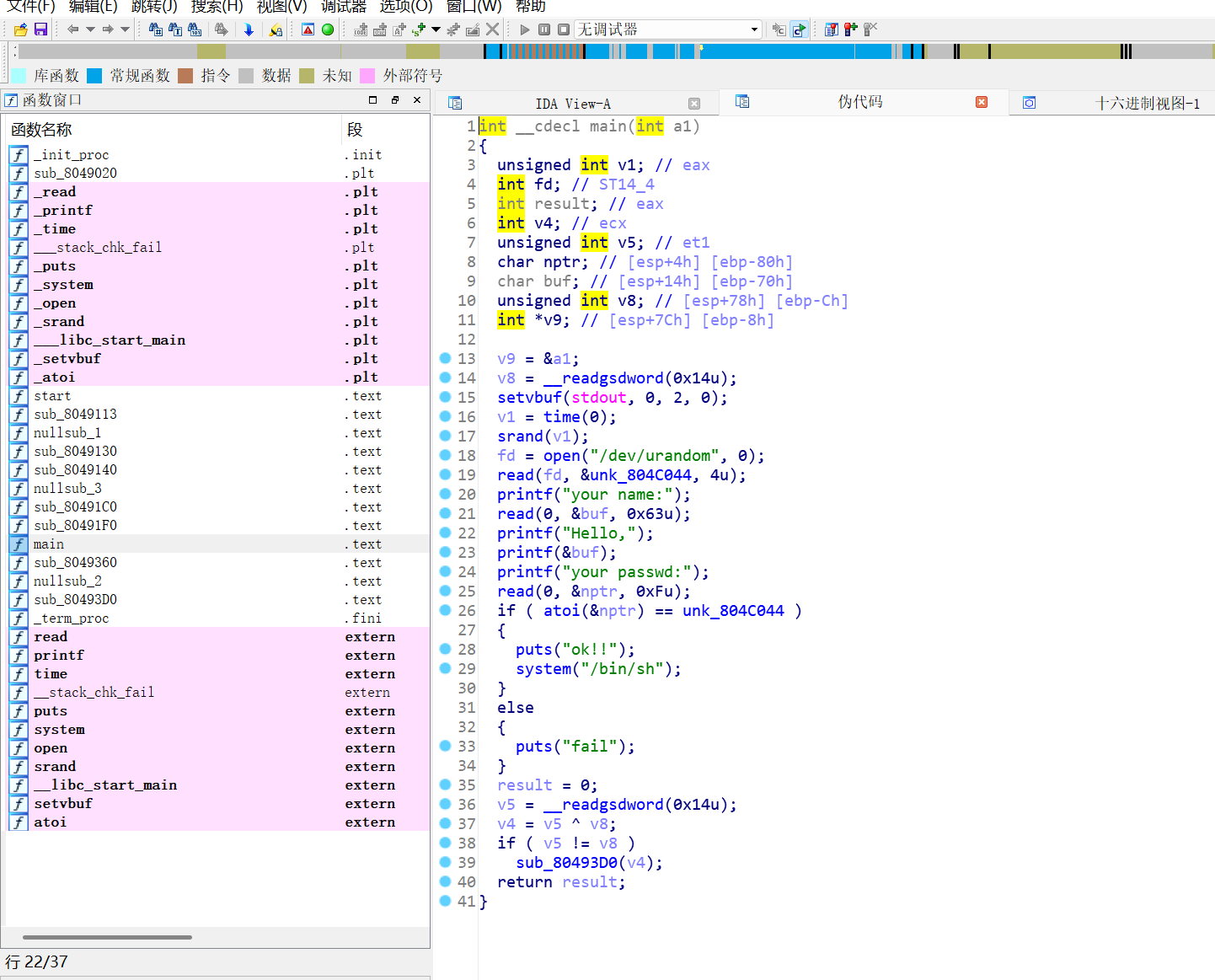 看了一下,就是打开一个文件从里面读取随机数(第18行),然后放进一个地址(第19行),然后到下面第16行的 if 表示如果我们输入的密码等于第19行地址里的内容,他就把权限给我们