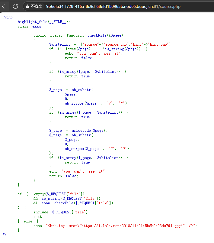• 如果 $page 直接等于 source.php 或 hint.php,允许访问。