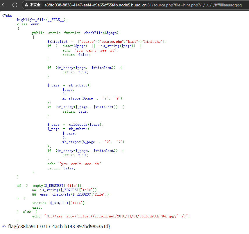 传进 file= 的是: hint.php?/../../../../ffffllllaaaagggg PHP 会提取 ? 前的部分(hint.php),发现它在白名单中,就放行了。