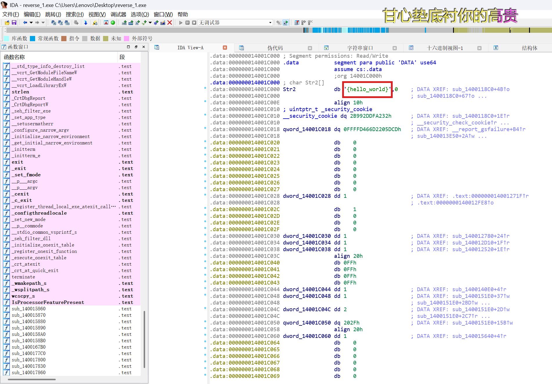 直观地可以看出sub_1400111D1表示的是print(经验之谈,一般这种有“”且是绿色的都是程序打印给你的东西)