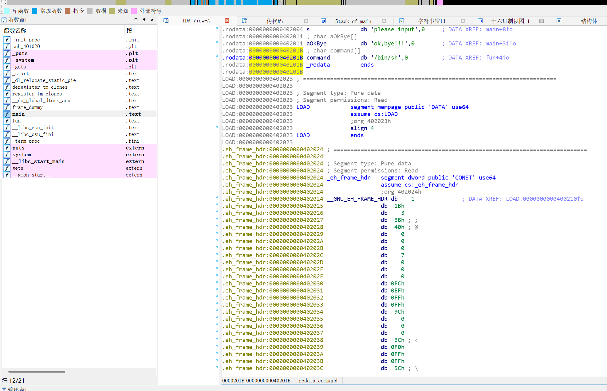 然后我们按Shift+F12打开string窗口,一键找出所有的字符串,去寻找它的后门函数