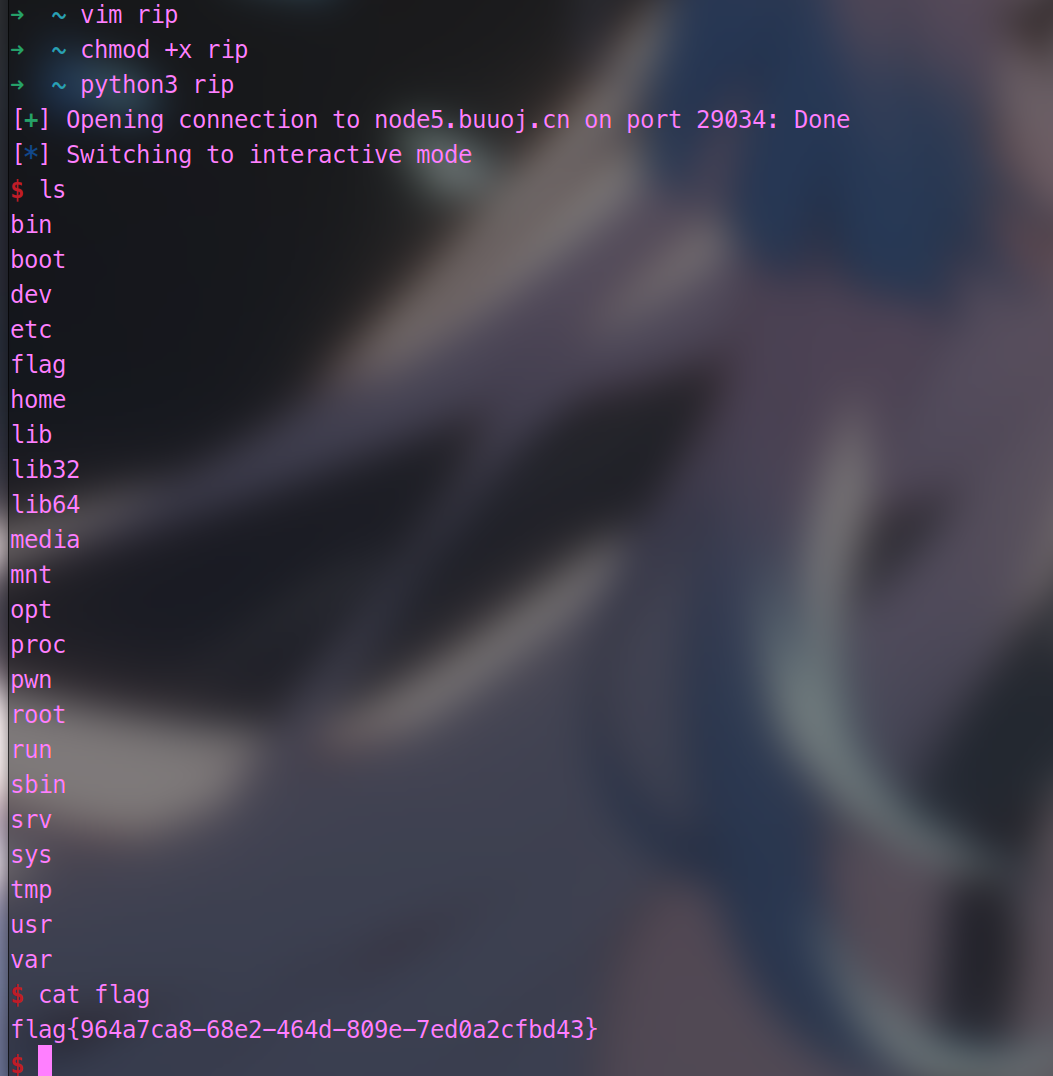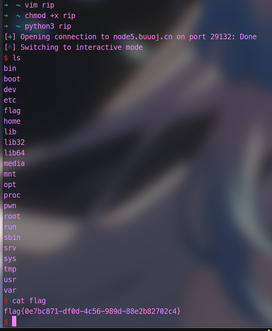 我们发送字节数据塞满它,然后把它的后门函数写入,我们就拿到了他的shell