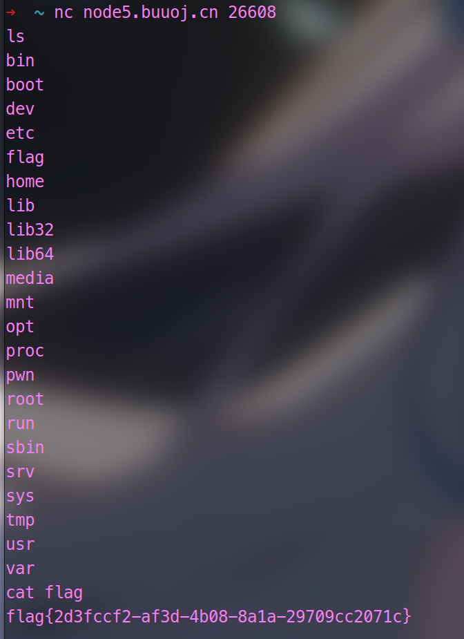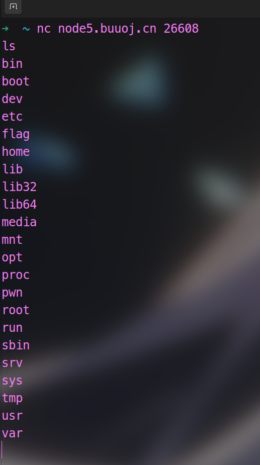 这道题连接后可能会没有显示东西出来,输入ls查看里面有啥文件(ls:列出当前地址/当前目录下的文件与子目录)